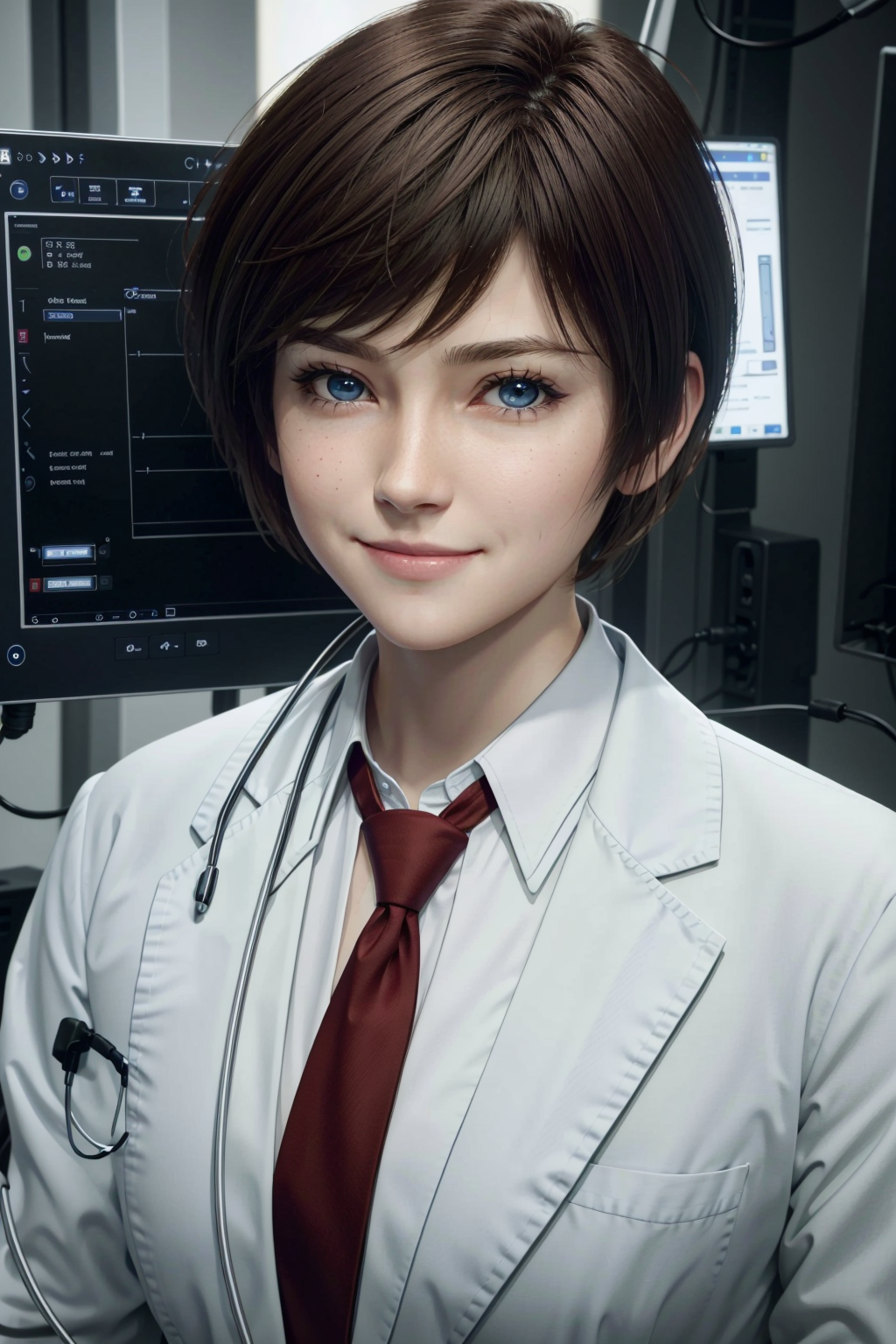 RebeccaRE, solo, necktie, realistic, brown hair, labcoat, doctor, looking at viewer, 1girl, short hair, red necktie, shirt, smile, lips, blue eyes, stethoscope, white shirt, rebecca chambers <lora:epi_noiseoffset2:1>, <lora:RebeccaRE:0.7>