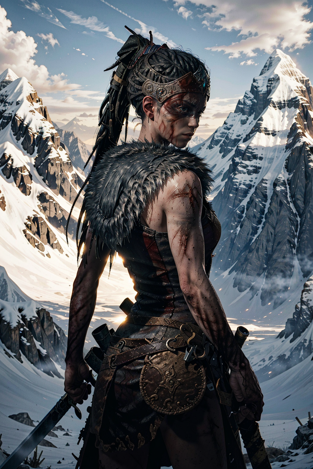 (masterpiece, best quality) 1girl, SenuaHell, solo, weapon, mountain, black hair, sword, ponytail, long hair, outdoors, looking back, sheath, blood, jewelry, scar, from behind <lora:epi_noiseoffset2:1>, <lora:SenuaHell:0.7>