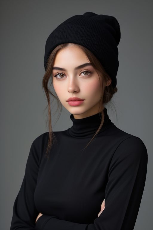 1girl, bellissima,armani style, Updo hair,Brunette,looking at viewer, shirt, long sleeves, hat, brown eyes, closed mouth, upper body, black eyes, black shirt, black headwear, crossed arms, realistic, beanie, Canon eos 5d mark 4,short lighting