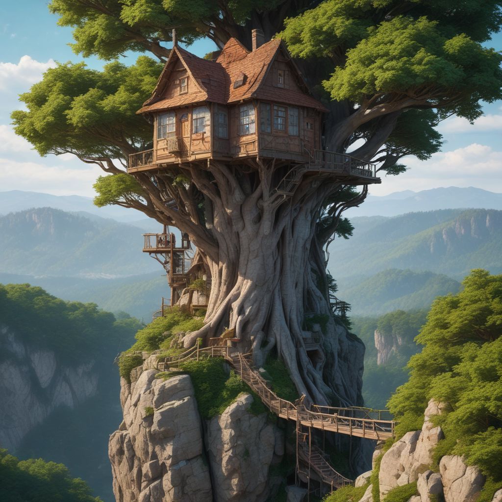 A house on top of a tree, tree house, house with roots fondation, house in the air, huge tree, cliff , roots, fantastic, fantasy, landscape, intricate details, colourful, shinny colors, photo-realistic, depth of field, dreaming, dreamwork