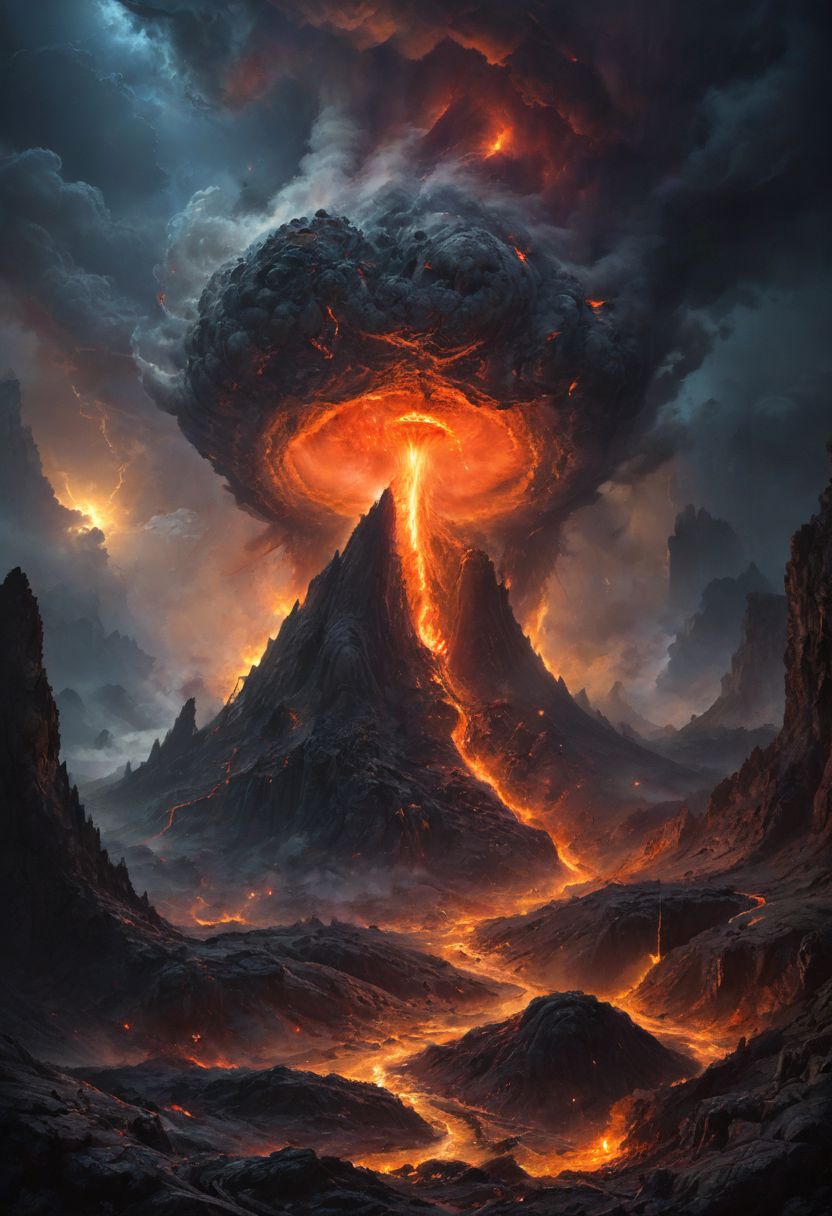 (score_6_up)(score_7_up)(score_8_up)(score_9) (masterpiece:1.2), best quality, (hyperdetailed, highest detailed:1.2), high resolution textures, cinematic scene, long distance ((horizon)), source: alien_planet, BREAK night time, ((large white moon with a red silhouette glow)), moonlight shines through many ((puffy clouds in the sky)) BREAK mystical landscape, multiple levels of landscape, circular, (long twisting landscape), fractals, symmetry landscape, ((in the horizon a very big and detailed Volcano errupting with small mushroom cloud, spewing lava)), ((large valley in the foreground)), clifftops, cliffs, crevices, ((cave)), sharp stalactites, (rows of sharp stalagmites on either side of the lava), ((cascading)), ((orange lava drips down)) multiple lava streams flowing downwards into the middle of the valey to a ((lava river)), ((many thick lava streams flowing around many rocks)), (multiple lava streams meandering around rocks), ((cascading lava pools)), lava (reflections off the surface of rocks), bioluminescent glows, BREAK epic, complex, by Todd Lockwood, by Alessio Albi, by Mikalojus Ciurlionis, (professional, intricate details, masterpiece, best quality:1.5), ((sharp focus)), high contrast, highest details,
