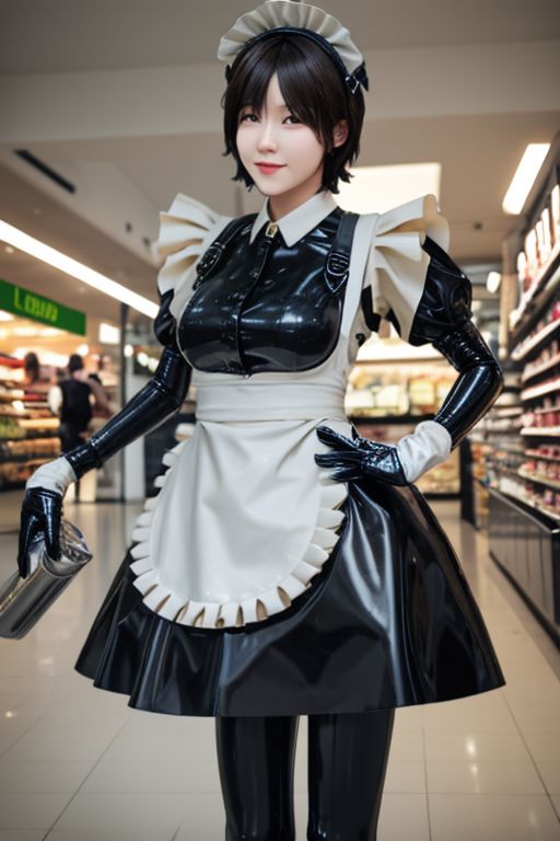 A pretty woman, short blonde hair, brown eyes, black latex , lemon0021, Bodysuit,gloves,maid,maid apron, thigh straps, long gloves, in a shopping centre.