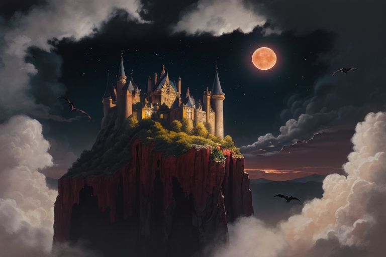 oil painting, of a castle on a cliff, forest, night, a flock of bats flying in the dark sky, reddish moon, clouds tainted red, dark theme, still life, shadows