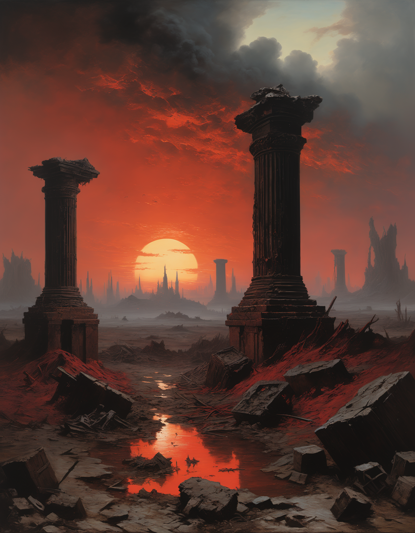 A crushed, desolate dark fantasy landscape, littered with the ruins of ancient civilizations and inhabited by a variety of strange swamp creatures. The sky above is a perpetual gloomy shade of crimson, casting a sinister glow over the scene. The land is marred by massive chasms, some still smoldering from recent eruptions, and covered in a thick layer of ash and debris. Rusted metal gates, twisted statues, and crumbling towers jut out from the morass, (Oil painting) (by Jean-François Millet), (by Gustave Courbet) , (by Jules Breton), close up, dark fantasy, <lora:add-detail-xl:2>