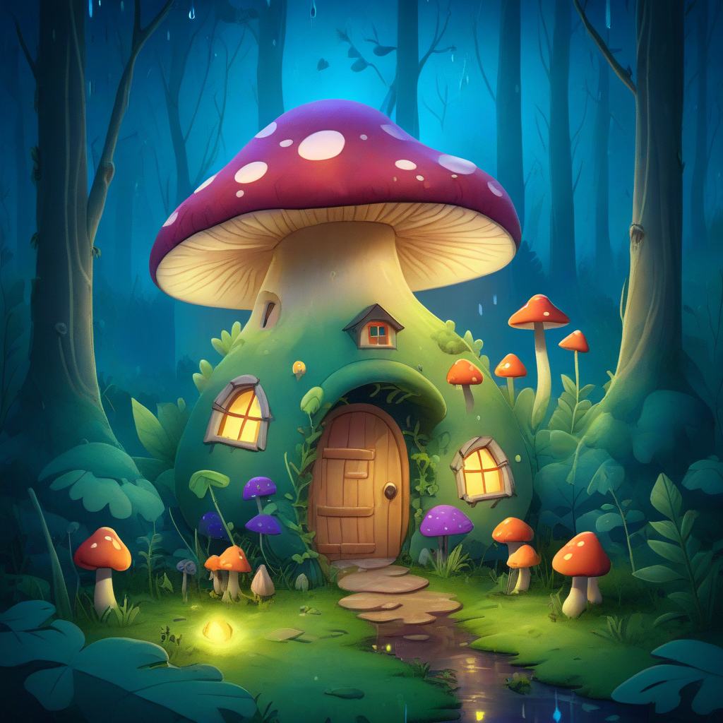 mushroom house in a magical forest at night, lamp, lightbulbs, windows, door, overgrown, (raining:1.4), puddle, lush, fireflies <lora:COOLKIDS_XL_0.3_RC:1>
