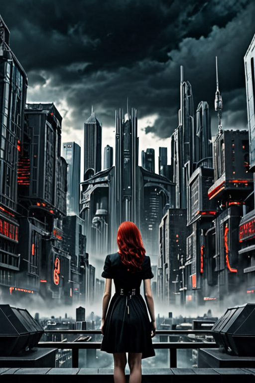 Gothic style subjects in the foreground from behind 1man (caucasian, twenty-five years old, dark brown hair, black shirt, tall, rugged) and 1woman (caucasian, twenty-five years old red hair, black dress), in the background an office building shaped like a skull with an epic cityscape with bilboards bearing skulls, dramatic, dark, night, futuristic, dystopian, evil, buildings, ocean, clouds in the sky, highly detailed, high quality, h. r. geiger, soft lighting, hyperrealistic <lora:futureskyline2_XL:0.5> . Dark, mysterious, haunting, dramatic, ornate, detailed