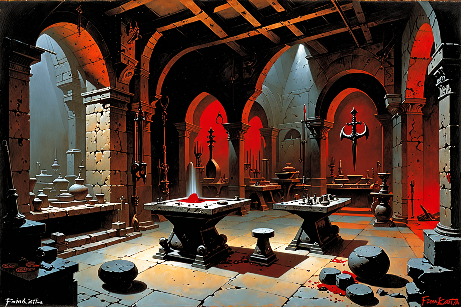 old school fantasy interior artwork, ((by Frank Frazetta)), ((spacious forge interior made out of a mix of stone metal and red demonic flesh)), forges and anvils, ((interior focus, dim light)), dark fantasy, grimdark, eerie, best quality, detailed oil painting, highly detailed, intricate details,