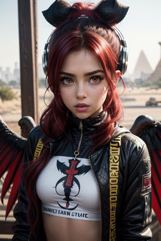 , solo, portrait of goodisis, goodnes ornate, egypt, energy, aura, dust, debris, Face looking, tanned skin, women, Ankh Cross, wings, ankh, Black Eyeliner Ariana Grande-Butera cyber punk Red hair Cara Jocelyn Delevingne lineage 2 blondclothing made from a fishing net with a large mesh - red army