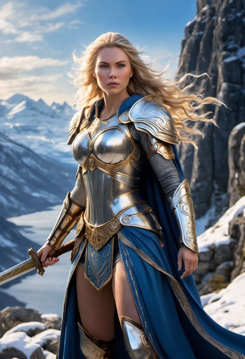 "Create a stunning digital artwork of a majestic Valkyrie. She has long, flowing blonde hair that glows with a golden hue, cascading down her back. Her piercing blue eyes exude strength and wisdom. She is adorned in intricately detailed silver and gold armor that shimmers in the light, with a flowing white and blue cape billowing behind her. She stands on a rocky cliff, overlooking a vast, serene Nordic landscape with snow-capped mountains and a clear blue sky. In one hand, she holds a gleaming sword, and in the other, a silver shield adorned with runic inscriptions. Her expression is one of determination and grace, embodying the spirit of a warrior goddess."