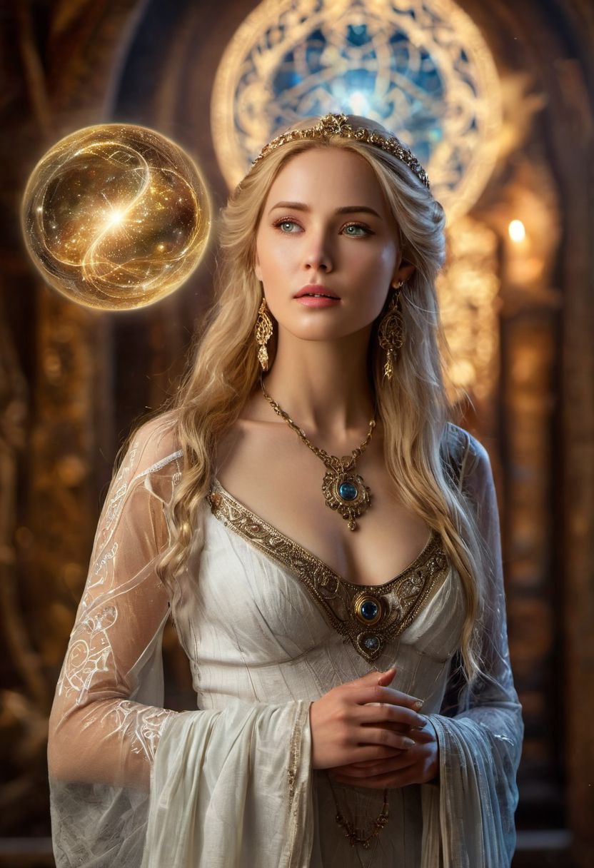masterpiece, best quality image of a beautiful female oracle. She stands gracefully in a mystical temple adorned with ancient symbols and glowing runes. Her long, flowing hair shimmers with a golden hue, cascading down her back. She wears an elegant, ethereal gown that seems to be woven from stardust and moonlight. In her hands, she holds a radiant crystal ball, emitting a soft, otherworldly light. Her eyes are deep and wise, reflecting the secrets of the universe. Surrounding her are floating, translucent scrolls with cryptic writings, and an aura of mystical energy envelops her, making her appear almost divine. 8K, high quality, photorealistic, realism, art photography, Nikon D850, 16k, sharp focus, masterpiece, breathtaking, atmospheric perspective, diffusion, pore correlation, skin imperfections, DSLR, 80mm Sigma f2, depth of field, intricate natural lighting,