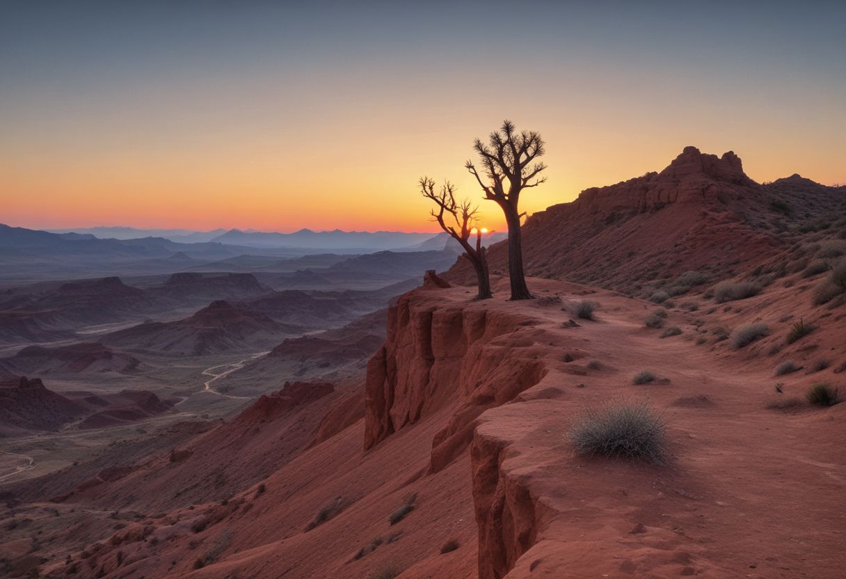 Infinite vistas of shifting, dune-studded sands undulate across the desert landscape as the crimson sun sinks towards the remote horizon. Towering sandstone buttes and mesas cast long shadows, their eroded profiles and wind-sculpted arches resembling the weathered works of ancient masons. In the sharp, oblique light, the red sand and eroded rocks appear to glow as if tinged by smoldering embers. A twisted, gnarled juniper clings precariously to life in the cracked, dry wash while a lone saguaro cactus stands as a solitary sentinel, silhouetted against the brilliant, cloud-streaked sunset. In the vast openness, the only sounds are the sighing whispers of the sifting sands and the haunting calls of nocturnal fauna preparing to emerge after nightfall.