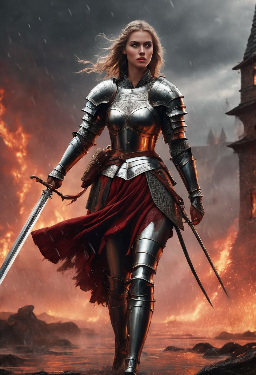 A stunning, high-quality, and ultra-realistic photo of a beautifull medieval female knight , high detailed face, full body, she's wearing intricately detailed and sexy armor without helmet, looking at the viewer, walks and carries an epic sword of fire, returning from a bloody battle. In the background, rain, a stormy and dramatic landscape is visible, with a battlefield covered in hundreds of victims. red water, creating an epic atmosphere. The image evokes a cinematic feel, with the female warrior as the central character the chaos of war,