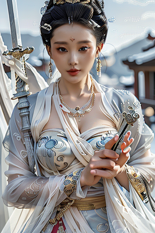 CR1.3,(flirtatious ,seductive:1.4),(RAW photo:1.2),(photorealistic:1.6),(lens 135mm,f1.8:1.2),(ultimate quality, masterpiece:1.3),(intricate details:1.2),(detailed face:1.2),dramatic,ray tracing,fashion photograph,<lora:goodhands_Beta_Gtonero:0.5:lbw=HAND>,good hands,Fixhand,fFaceDetail,Full body,Sharp focus,cinematic lighting, <lora:dunhuangV3:1:lbw=CLOTHING>,(floating clothes,thighs,dunhuang cloths,hanfu,waist cape,strapless,navel,robe:1.2), <lora:æä¸æ¡girlslike_lyt25:0.8:lbw=FACE>,, <lora:UnlimitedBladeWorks1.6-Lycoris:0.5:lbw=ACT>,Unlimited Blade Works,holding weapon,<lora:ChineseweaponsV2:0.3>,å,ä¸å½å µå¨, <lora:Yanxin_ Swordswoman:0.8:lbw=ACT>,swordswoman,(holding sword,sword, fighting stance:1.6),, (1girl,solo,outdoors,war castle:1.6),confident smile,beautful face,<lora:PerfectBreastsV4-offset:0.5:lbw=BODY>,(large breasts, narrow waist:1.2),sexy body,perfect body,shiny hairs,<lora:zanhua_v1:0.65>,zanhua,hair ornament,earrings,necklace,jewelry, (anatomically correct hands,anatomically correct feet,anatomically correct body:1.6),