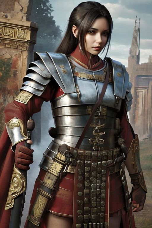 female roman warrior wearing red robes and iron armor, centurion, holding a gladius sword, <lora:RealmsOfTheDead-10:0.7>, <lora:zoom_slider_v1:2>, epiCPhoto,