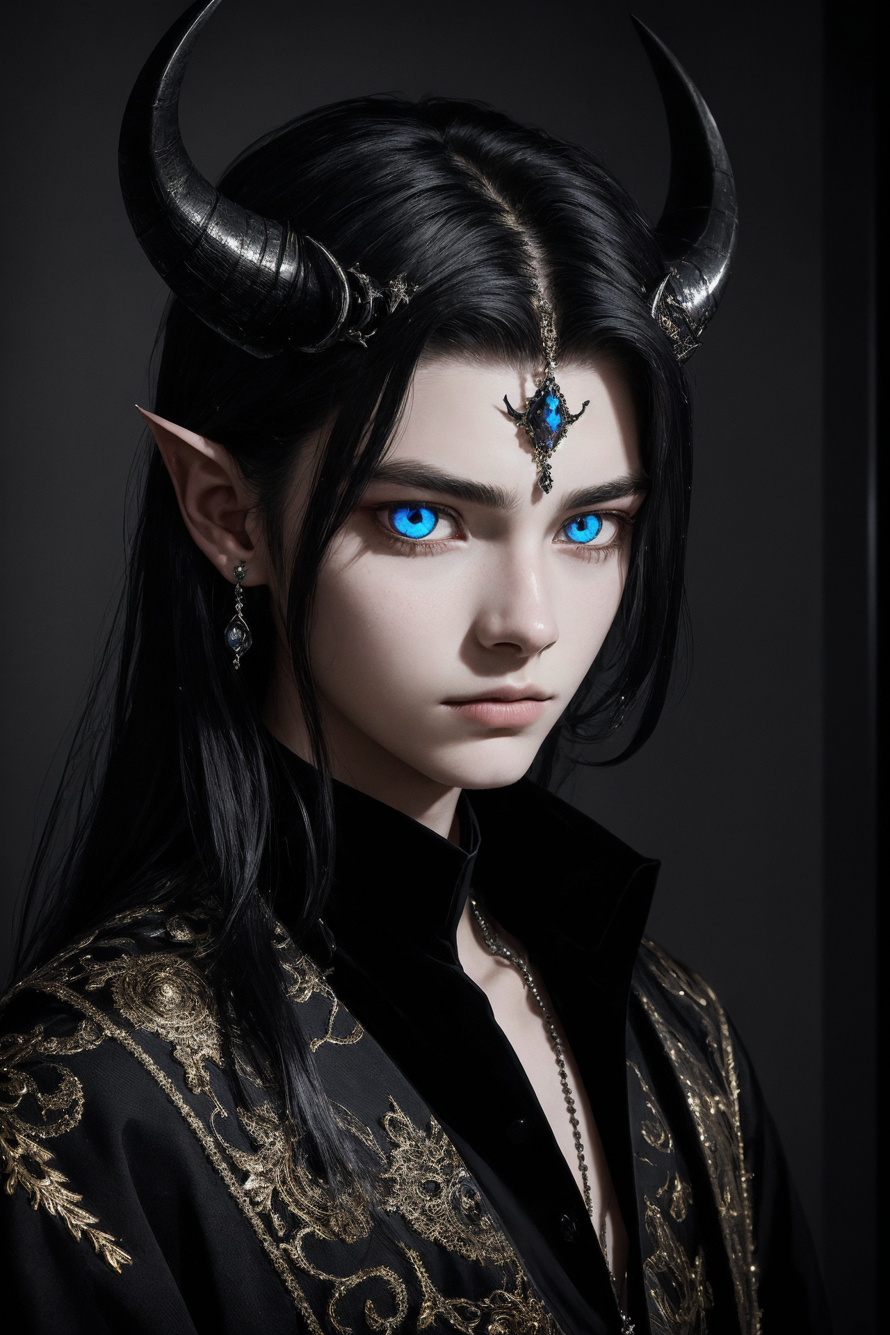 8k portrait of beautiful 16 year old demon boy, he is a shadow demon, he has horns, he has jewelry on, he is in a shadowy room, stark lighting, intricate, elegant, highly detailed, majestic, digital photography, masterpiece, sidelighting, (finely detailed beautiful eyes: 1.2), hdr