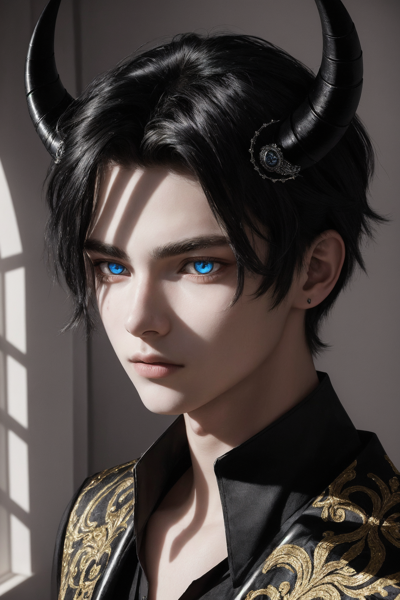 8k portrait of beautiful 16 year old demon boy, he is a shadow demon, he has horns, he has jewelry on, he is in a shadowy room, stark lighting, intricate, elegant, highly detailed, majestic, digital photography, masterpiece, sidelighting, (finely detailed beautiful eyes: 1.2), hdr