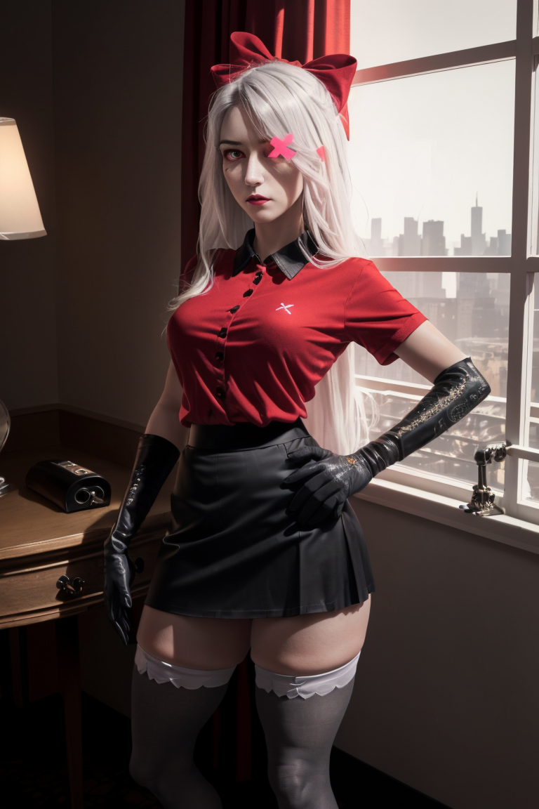 (Vaggie:1.0), (hotel outfit, red shirt, black skirt, stockings, gloves:1.5), (pink sclera, black pupil, grey skin, white hair, long hair, hair bow:1.2), (realistic:1.2), (masterpiece:1.2), (full-body-shot:1),(Cowboy-shot:1.2), neon lighting, dark romantic lighting, (highly detailed:1.2),(detailed face:1.2), (gradients), colorful, detailed eyes, (detailed landscape:1.2), (natural lighting:1.2), (cute pose:1.2), (solo, one person, 1girl:1.5), standing, <lora:VaggieHazbinHotel:0.8> <lora:add_detail:0.15> <lora:hipoly3DModelLora_v10:0.05> <lora:RSERomantic_RSESofiko_RSEEmma-v1:0.1> <lora:BeautifulEyes:0.65> <lyco:coloredSkin-08:0.4>, standing by a large window with the view of hell at night on fire in the background