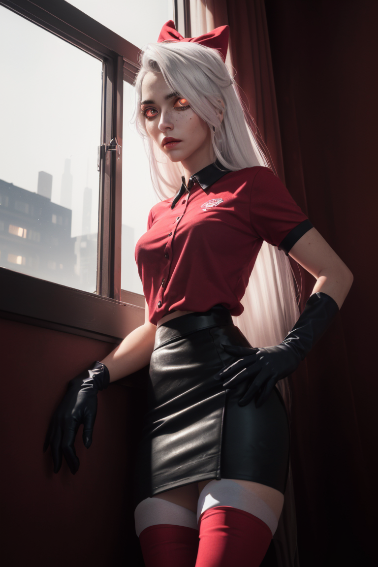 (Vaggie:1.0), (hotel outfit, red shirt, black skirt, stockings, gloves:1.5), (pink sclera, black pupil, grey skin, white hair, long hair, hair bow:1.2), (realistic:1.2), (masterpiece:1.2), (full-body-shot:1),(Cowboy-shot:1.2), neon lighting, dark romantic lighting, (highly detailed:1.2),(detailed face:1.2), (gradients), colorful, detailed eyes, (detailed landscape:1.2), (natural lighting:1.2), (cute pose:1.2), (solo, one person, 1girl:1.5), standing, <lora:VaggieHazbinHotel:0.8> <lora:add_detail:0.15> <lora:hipoly3DModelLora_v10:0.05> <lora:RSERomantic_RSESofiko_RSEEmma-v1:0.1> <lora:BeautifulEyes:0.65> <lyco:coloredSkin-08:0.4>, standing by a large window with the view of hell at night on fire in the background