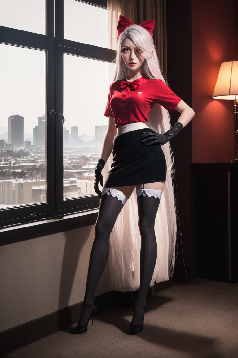 (Vaggie:1.0), (hotel outfit, red shirt, black skirt, stockings, gloves:1.5), (pink sclera, black pupil, grey skin, white hair, long hair, hair bow:1.2), (realistic:1.2), (masterpiece:1.2), (full-body-shot:1),(Cowboy-shot:1.2), neon lighting, dark romantic lighting, (highly detailed:1.2),(detailed face:1.2), (gradients), colorful, detailed eyes, (detailed landscape:1.2), (natural lighting:1.2), (cute pose:1.2), (solo, one person, 1girl:1.5), standing, <lora:VaggieHazbinHotel:0.8> <lora:add_detail:0.15> <lora:hipoly3DModelLora_v10:0.05> <lora:RSERomantic_RSESofiko_RSEEmma-v1:0.1> <lora:BeautifulEyes:0.65> <lyco:coloredSkin-08:0.4>, standing by a large window with the view of hell at night on fire in the background