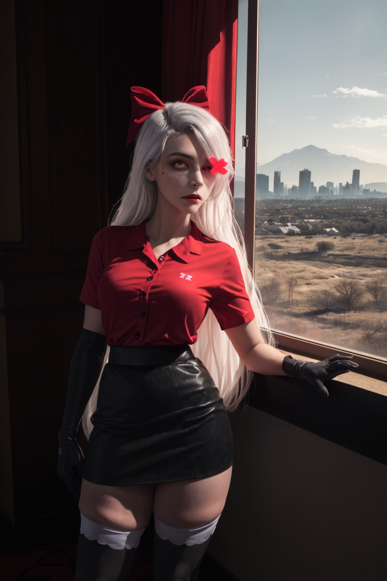 (Vaggie:1.0), (hotel outfit, red shirt, black skirt, stockings, gloves:1.5), (pink sclera, black pupil, grey skin, white hair, long hair, hair bow:1.2), (realistic:1.2), (masterpiece:1.2), (full-body-shot:1),(Cowboy-shot:1.2), neon lighting, dark romantic lighting, (highly detailed:1.2),(detailed face:1.2), (gradients), colorful, detailed eyes, (detailed landscape:1.2), (natural lighting:1.2), (cute pose:1.2), (solo, one person, 1girl:1.5), standing, <lora:VaggieHazbinHotel:0.8> <lora:add_detail:0.15> <lora:hipoly3DModelLora_v10:0.05> <lora:RSERomantic_RSESofiko_RSEEmma-v1:0.1> <lora:BeautifulEyes:0.65> <lyco:coloredSkin-08:0.4>, standing by a large window with the view of hell at night on fire in the background