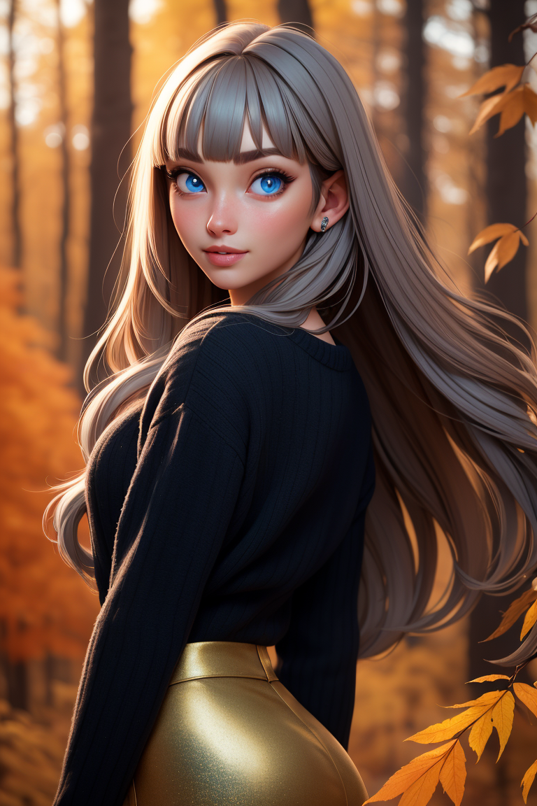 3dmm style,close up of a beautiful woman, pale blue eyes, chestnut hair with silver highlights. (Very long hair, blunt bangs, blunt layers:1.3), sexy pose, dark theme, earthy tones, muted colors, high contrast, (natural skin texture, hyperrealism, soft light, sharp), standing in an autumn forest, (wind:1.4), golden leaves. black skirt, with glitter, 1girl, star eye, blush, (realistic:1.5), (masterpiece, extremely detailed CG unity 8K wallpaper, best quality, highres:1.2), (ultra_detailed, UHD:1.2), (pixiv:1.3), (bishoujo:1.2), perfect illumination, distinct, looking at viewer, unreal engine, bioluminescent light, perfect face, detailed face, beautiful eyes, (bright skin:1.3)