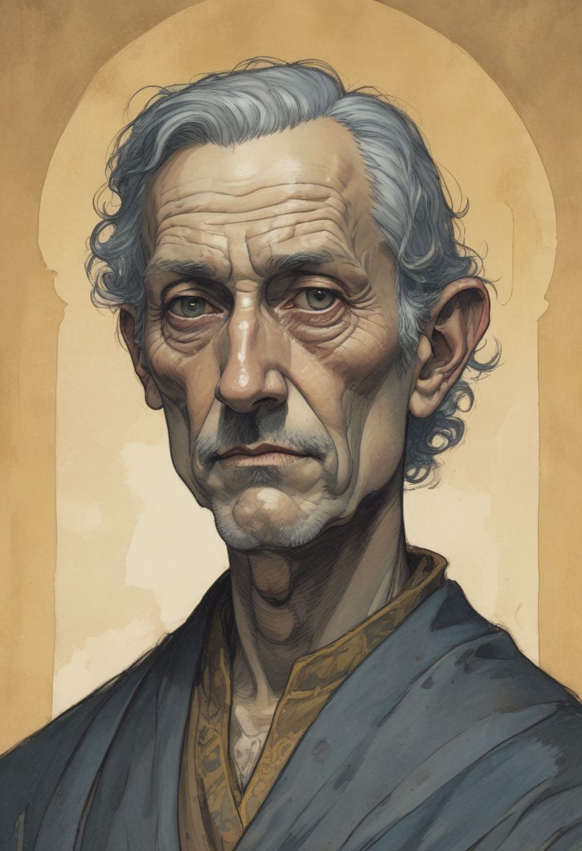 Portrait of a Short Stocky Wizened male medieval human with Uneven Blue to gray eyes, very short mouse-colored Brown Pepper-corned hair, yellow cast (sallow) White skin, reverse Oval face, Rough forehead, Arched eyebrows, Hollow cheeks, Sharp nose, Compressed mouth, and Receding chin, art by Mike Mignola and Grzegorz RosiDski