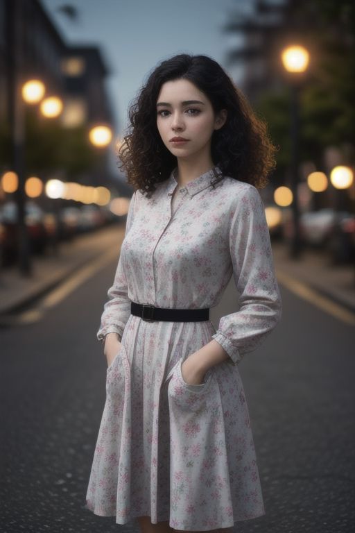 Midshot, young woman, Spring outdoor, floral dress, blue belt, standing,Spring background, street lights, medium shot, contemplative expression, curly hair, natural makeup, warm color tone, hand in pocket, depth of field, fashionable attire, , dusk lighting, (freckles:0.5),