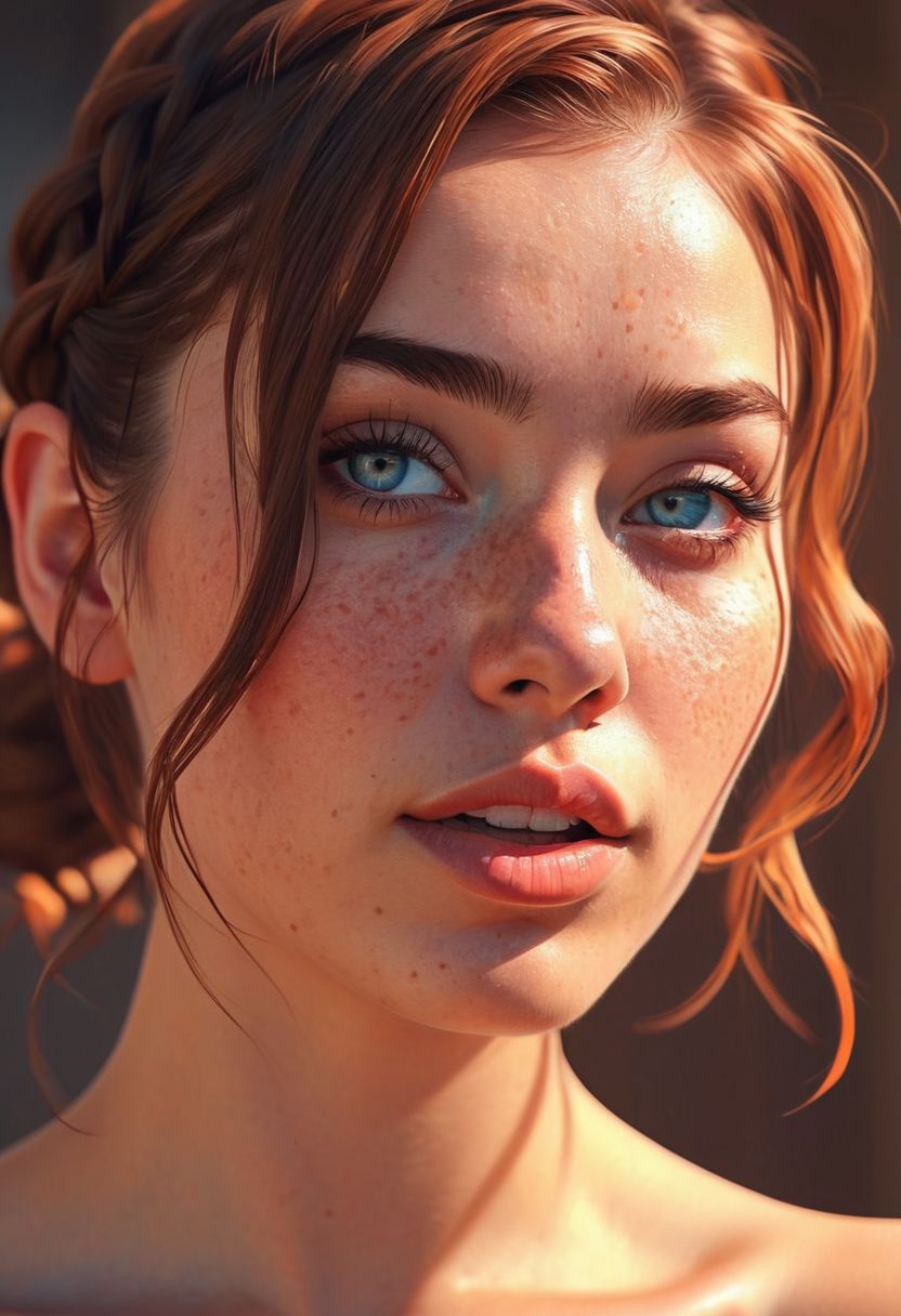 style by Ilya Kuvshinov best quality image, phenomenal playful shadows,amazing realistic light, majestic-braided hair, mesmerise-naughty,light-freckles-sunburned-face, party-makeup, tattoo, breathtaking crispy-detailed, thick-lips, realistic-eye, unscrupulous-smile, cute woman, brunette hair, eyes with blue and brown mixed color,