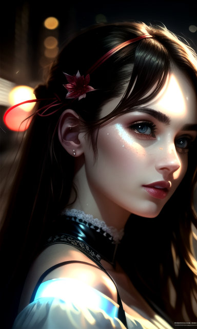(8k, masterpiece:1.2), Night view of city streets, The lights of the night, (ultra highres:1.0), watercolor, a beautiful woman, wearing loose reflective white blouse, weird future fashion with straps, shoulder, thorny hair ribbons, (portrait shot, close up:1), extremely luminous bright design, (detailed face), heavy glow makeup, model photoshoot style, very long hair, intricate, elegant, hdr, backlighting, realism, (hyperrealism), (cinematic), (hyperdetailed:1.2), best quality, (best quality:1.0), close up, <lora:Cyberpunk:1>