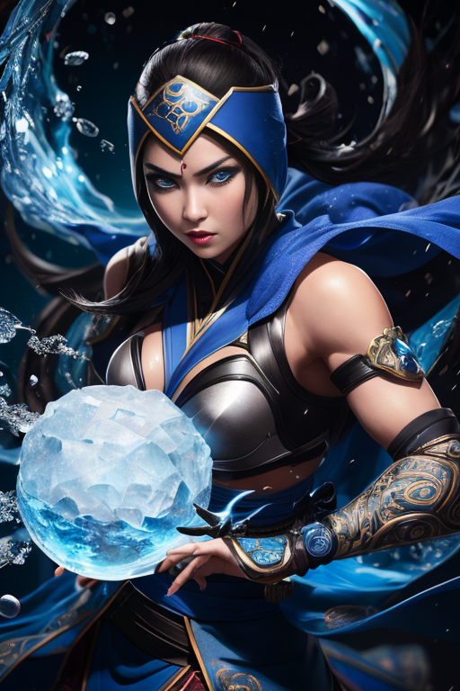 1girl, portrait of female cute mksubzero battle with group of ninja, glowing blue eyes, ice, blue, cold, energy, aura, swirl water, ornate, detail, <lora:ARWmksubzero:1>