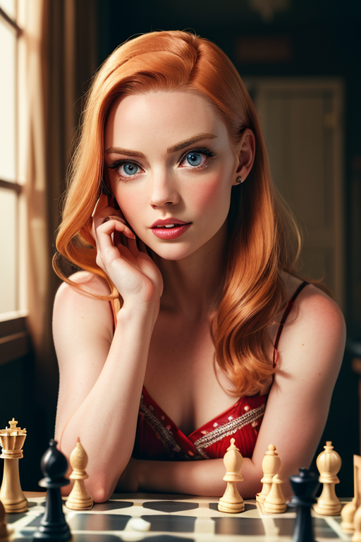 Deborah Ann Woll, natural redhead woman, wearing dress from the 1950s era, chess player, intricate chess board, 50mm, cinematic, kodak portra 400, photograph by Martin Schoeller, Natural Light,<lyco:Deborah Ann WollV7:0.5> <lora:Anya Joy:0.5>