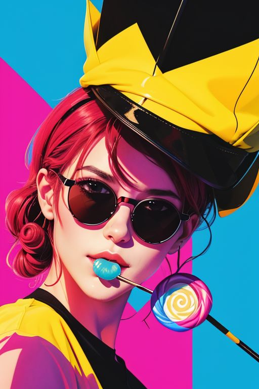 high quality illustration of a cocky confident stunningly beautiful woman, holding large transparent lollipop, (one lollipop:1.3), vibrant neon colors, cool sunglasses, silhouette, illustration, looking at viewer, lofi,