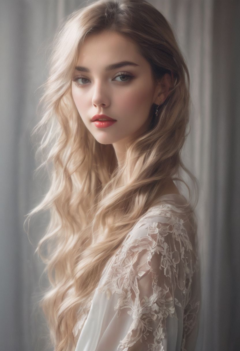 Capture the essence of a stunning, seductive 18-year-old girl exuding an irresistible allure that captivates the viewer's gaze. She stands in a pose that radiates confidence and sensuality, her flawless, radiant skin glowing under a soft, ethereal light. Her luscious, flowing hair cascades down her back in silky waves, framing her angelic face with delicate features and captivating eyes that seem to hold a world of secrets. The girl's attire is both elegant and provocative, accentuating her perfect curves and slender figure with subtle hints of lace and satin that tease the imagination. Every curve and contour of her body is meticulously rendered to perfection, highlighting her natural beauty in a way that is both alluring and tasteful. As she gazes directly at the viewer with a sultry smile playing on her lips, there is an undeniable magnetism in her expression that draws you in, inviting you to explore the depths of her captivating gaze. The atmosphere around her pulses with a sense of intimacy and seduction, creating a masterpiece that is both breathtaking and unforgettable.