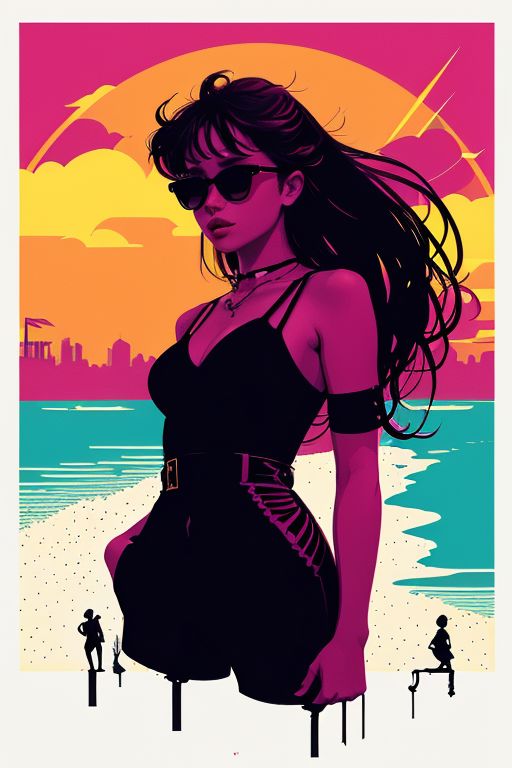 high quality illustration of a cocky confident stunningly beautiful woman, vibrant neon colors, cool sunglasses, silhouette, illustration, looking at viewer, lofi, hot weather, paris