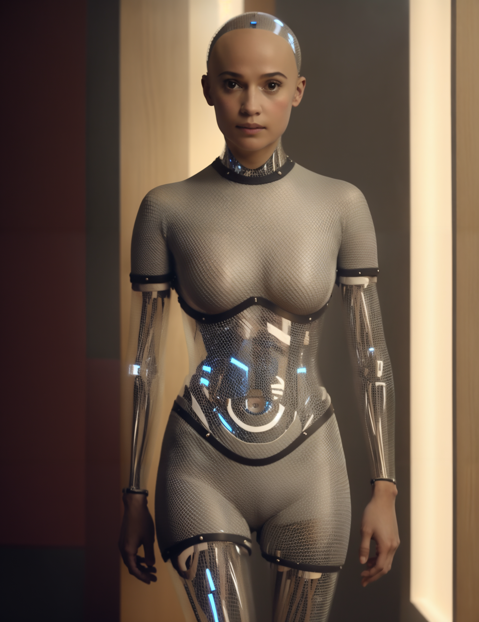 <lora:AVA_Ex_Machina:1> ava, robot bodyparts, transparent skin, sexy female, solo, hands hips, big tits