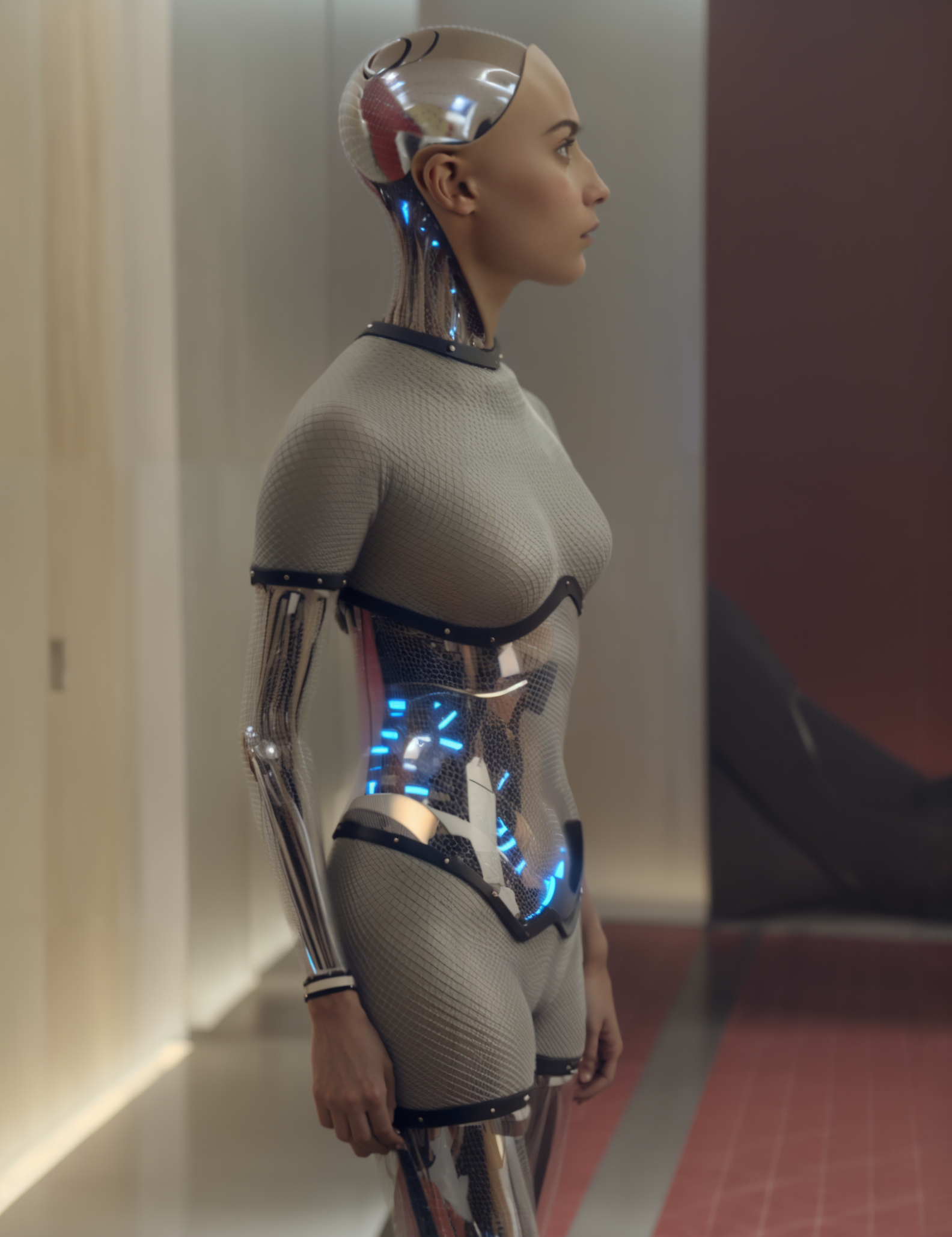 <lora:AVA_Ex_Machina:1> ava, robot bodyparts, side view, sexy female, solo