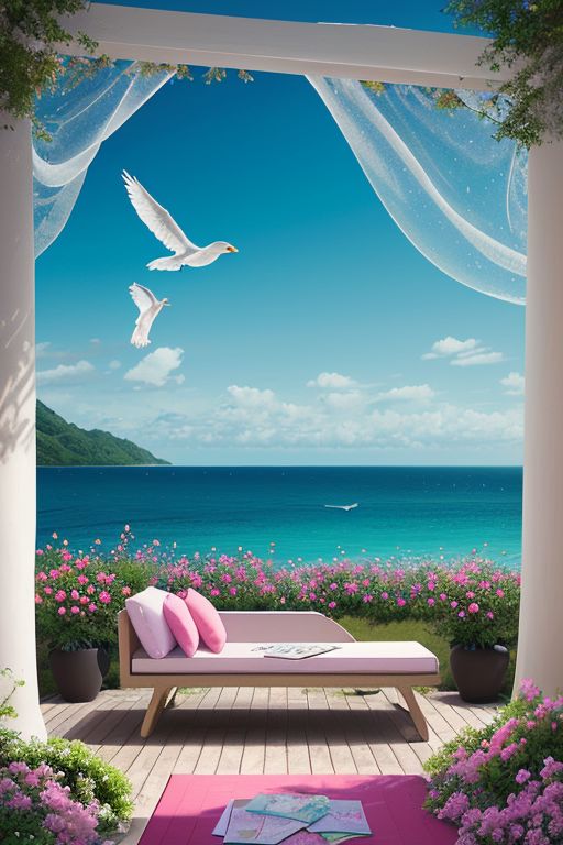 A surreal and whimsical scene of a floating blue daybed, adorned with a delicate white mosquito netting and a cascade of vibrant pink flowers. The daybed appears to be gently floating on the ocean's surface, surrounded by crystal-clear turquoise waters and a few seagulls in the sky. The overall atmosphere of the image is dreamy and serene, evoking a sense of tranquility and escapism from the mundane world.