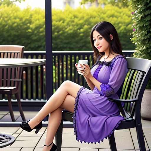 A young woman is holding a (cup of tea in her hand). She is outside sitting on a patio chair. She is wearing a purple English dress and wearing black glass slippers.