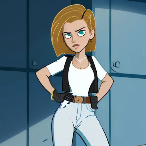 kim possible, and18, 1girl, android 18, solo, blonde hair, blue eyes, belt, jeans, pearl_necklace, bracelet, black gloves, white shirt, short hair, short sleeves, earrings, blue pants, open vest, black vest, large breasts