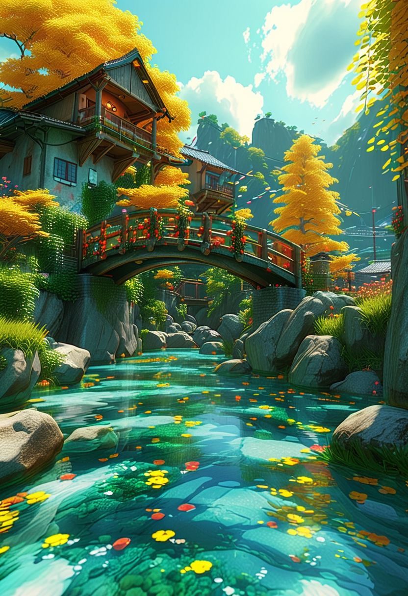 (ultra high res:1.4), (masterpiece), (beautiful lighting:1.4) , lush greenery and mountains, Bright sunlight illuminates the crystal-clear water, (deep underwater), anime, half above water and half below water , (clear underwater), beautiful sky with clouds, colourful fish , depth, small yellow, costal village, bridge across the water, ice rings in the sky
