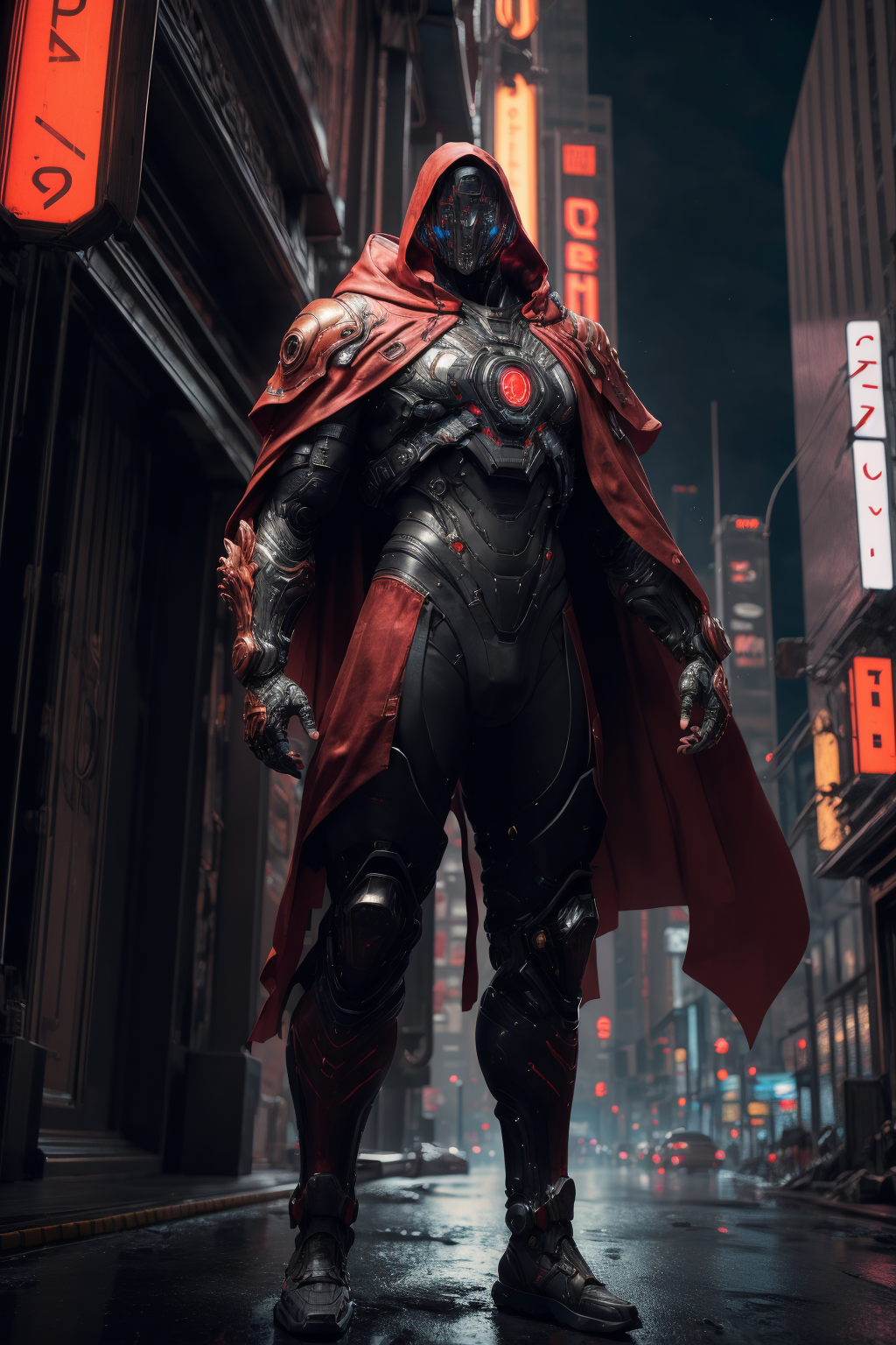 (full body, (dynamic pose)), male android humanoid, thick cloth dark cloak, [dark | red metallic armour], glowing red parts of the armour, splashes of red, glowing red eyes, advanced civilization, a cyberpunk structure, towering structures, neon signs, immersed in the beautiful lights, (rim lighting, distant moonlight, night), (cinematic, best quality, masterpiece, ultra HD textures, highly detailed, hyper realistic, intricate detail, 8k, photorealistic, concept art, matte painting, autodesk maya, vray render, ray tracing, hdr), (dslr, full frame, 16mm focal length, f/8 aperture, dynamic perspective, dynamic angle, golden ratio, wide photography, wide field of view, deep depth of field, (zoom out:1.1)) <lora:MISC-epi_noiseoffset2:0.3> <lora:urbansamuraiv3testing:0.3> techwear, urbansamurai, <lora:CHAR-Robort:0.6> (robort:1.1), <lora:lou:0.2> <lora:hipoly_3dcg_v7-epoch:0.2>3d, realistic <hypernet:dr0ne_1:0.35> <hypernet:sxzBloom_sxzBloom:0.2><hypernet:LuisapSciFiHard_v1:0.3>, <lora:add_detail:0.3>