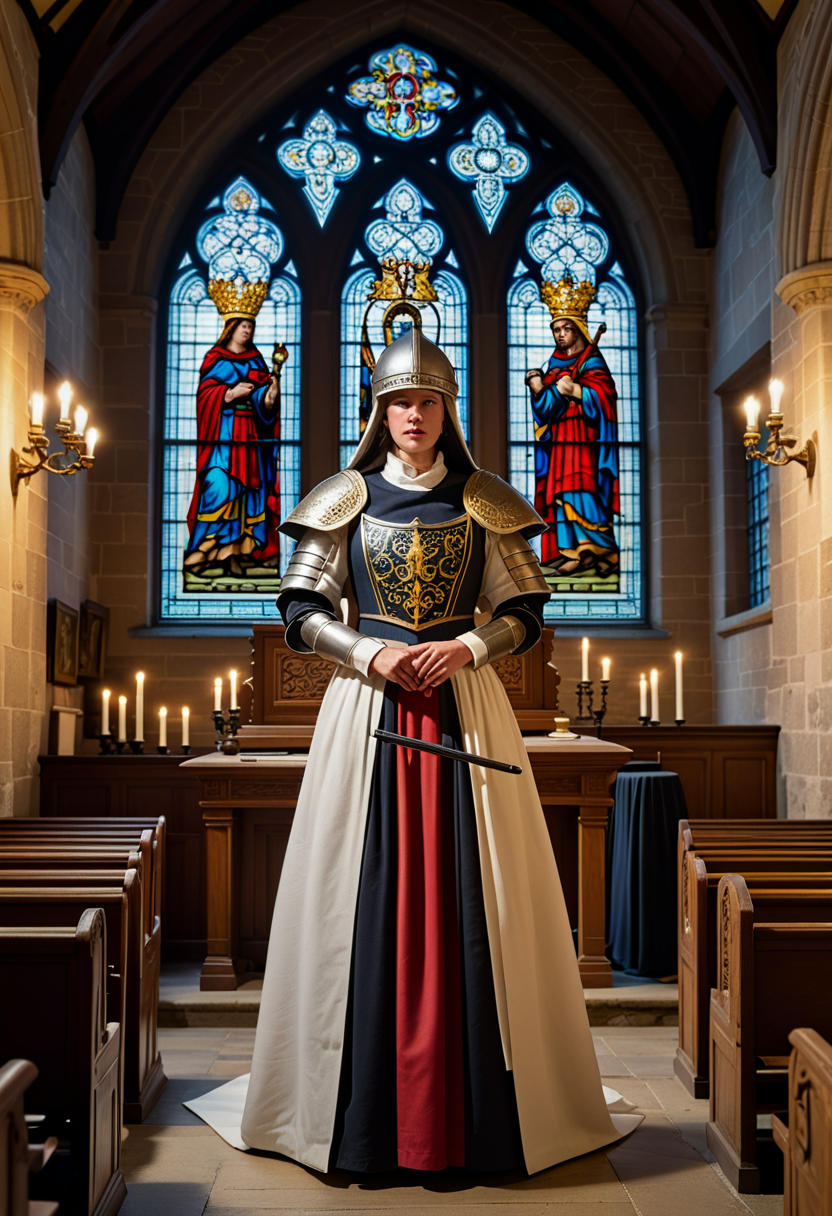 (stacked papercut art by kiri ken) of a medieval soldier woman, wearing Open-faced helmet with cheek guards, sleeveless tabard with family crest, linen hose, leather moccasins, holding Crossbow ,set in medieval era, Castle Chapel, Serene sanctuary with stained glass windows depicting saints, wooden pews facing an altar, candlelit sconces on the walls, a choir loft with a pipe organ, and the echo of Gregorian chants , award winning, very aesthetic
