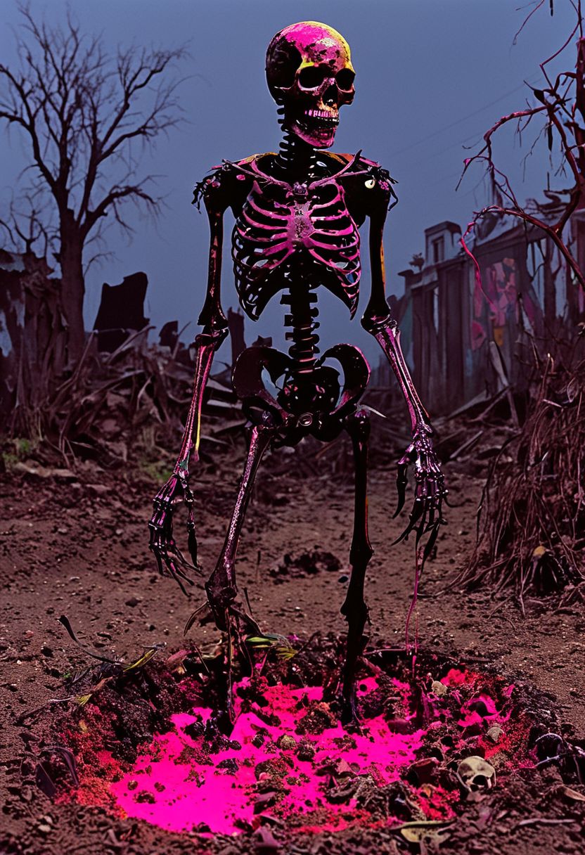 skeletal zombie with tattered rags, clawing its way out of a dirt grave silhouette , in the style of the decaying empire of Wrstreich, dark magic and grotesque creatures abound, inspired by Sean Aaberg's punk aesthetic, dark fantasy world combines grim landscapes with vibrant, exaggerated neon colorful art, old 80's VHS dark fantasy, VHS screen grab, grainy, old footage