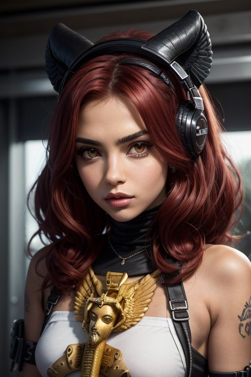 , solo, portrait of goodisis, goodnes ornate, egypt, energy, aura, dust, debris, Face looking, tanned skin, women, Ankh Cross, wings, ankh, Black Eyeliner Ariana Grande-Butera cyber punk Red hair Cara Jocelyn Delevingne dark angel - green skin - red army - lady - demon