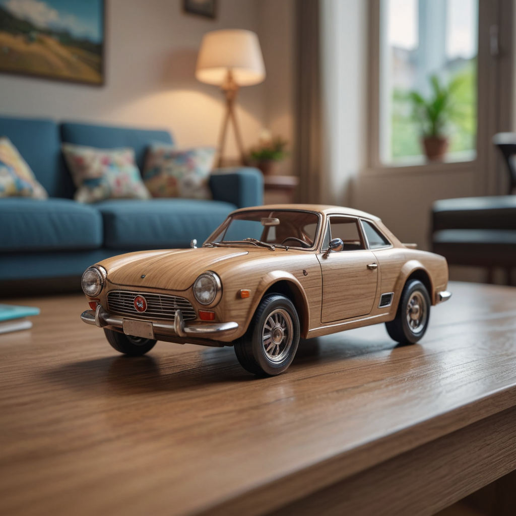 Tiny Wooden Car toy on the table in the living room, Anime cartoon style, magical realism, environmental themes, breathtaking landscapes, highly detailed, cool color, shift tilt lense, Miki Asai Macro photography, close-up, hyper detailed, trending on artstation, sharp focus, studio photo, intricate details, highly detailed, by greg rutkowski<lora:detailed_notrigger:1.0>