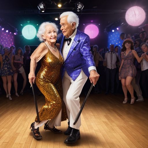 8k, highly detailed, masterpiece,highly detailed face,1 woman, 95 years old, elderly, dancing with a walker or cane. Background disco with light up floors, disco balls,