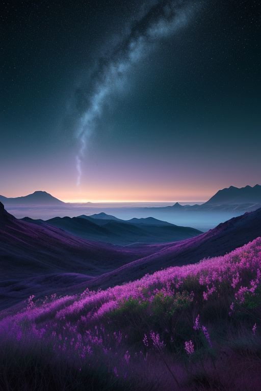 The sky should be a mesmerizing blend of deep blues and soft purples, with a faint, ethereal glow on the horizon. Show a mystical terrain, featuring delicate, bioluminescent flora and fauna that illuminate the landscape with gentle, otherworldly radiance. Let the scene emanate a sense of tranquility, mystery, and a touch of magic.
