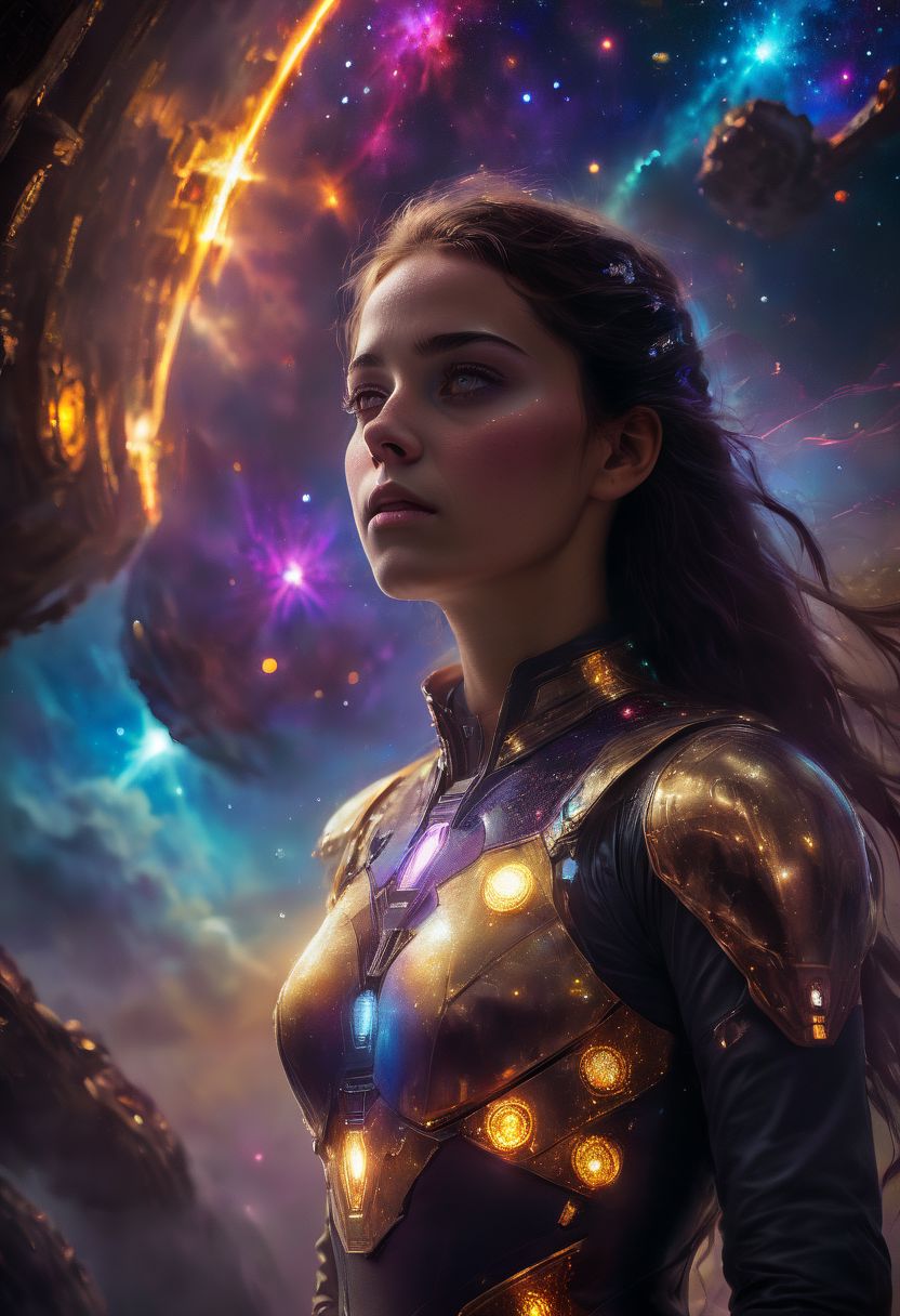 (masterpiece, wide angle, cinematic establishing shot, young adult european woman, highly detailed background:1.2),volumetric lighting,subsurface scattering,dynamic pose,(special effects, color grading, fantasy aura),(high quality:1.4),(best quality:1.4),(masterpiece:1.4),official art,official wallpaper,surreal,(detailed landscape:1.1),(whimsical atmosphere:1.1),(powerful energy:1.1),vibrant colors,(detailed:1.05),(extremely detailed:1.06),sharp focus,(intricate:1.03),cinematic lighting,(extremely intricate:1.04),(adorned:1.09), A woman, captain of a starship, navigates through a nebula, her face illuminated by the cosmos, as she charts a course to distant galaxies. <lora:xl_more_art-full_v1:0.5>, <lora:add-detail-xl:1.0>, <lora:glowneon_xl_v1:0.75>, <lora:aesthetic_anime_v1sXL:0.8>, <lora:polyhedron_all_sdxl-000004:0.20>, <lora:extremely_detailedXL:0.50>, <lora:sd_xl_dpo_lora_v1:0.50>, <lora:EnvyAwesomizeXL01:0.50>, <lora:NicolaSamori-DarkArtStyleXL:0.20>, <lora:SDXLFaeTastic2400:0.30>, <lora:ral-dissolve-sdxl:0.20>, <lora:linquiveraXL:0.20>, <lora:DisturbiaXL:0.20>, <lora:AnalogRedmondV2-Analog-AnalogRedmAF:0.25>,