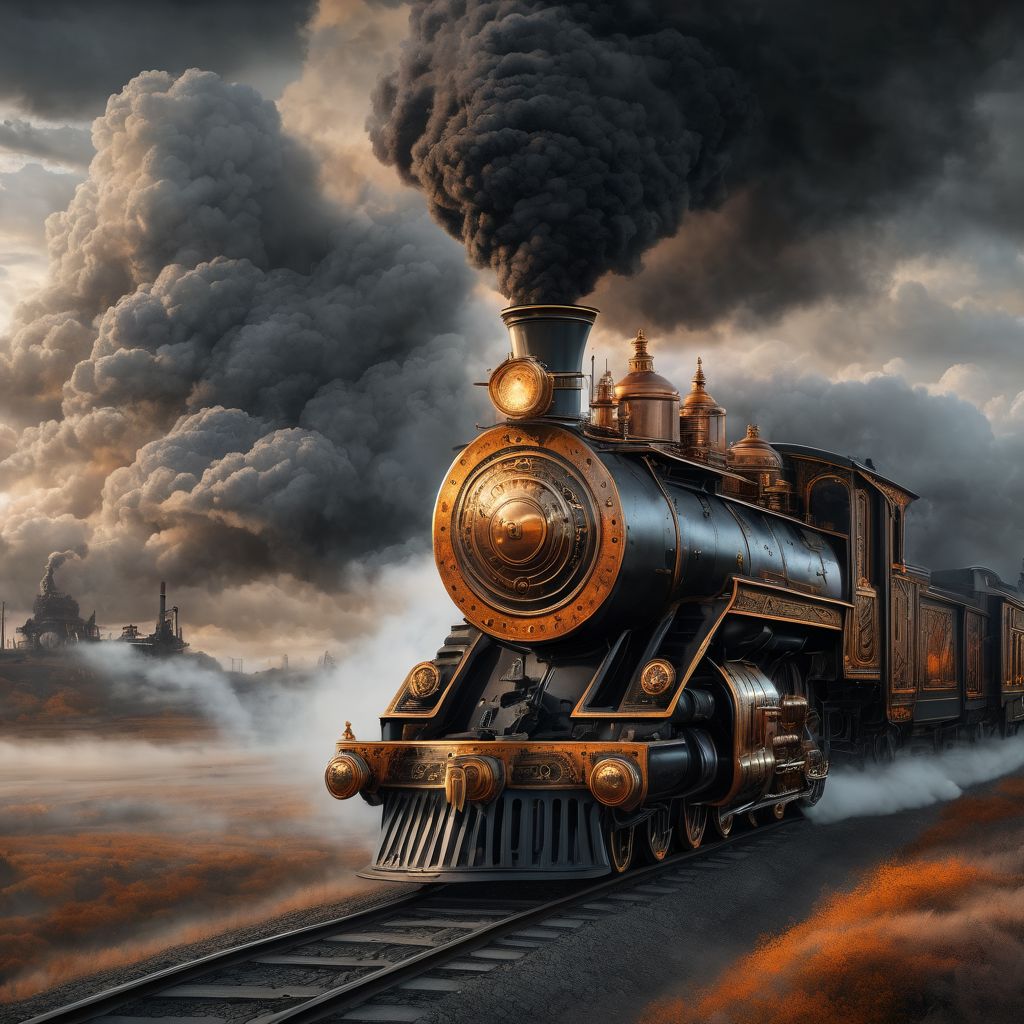 Hyperrealistic steampunk train locomotive detailed with black paintings, ethereal clouds, mist atmosphere, vast cloudy sky with orange and dark teints, dramatic lighting, dark mystical atmosphere,
