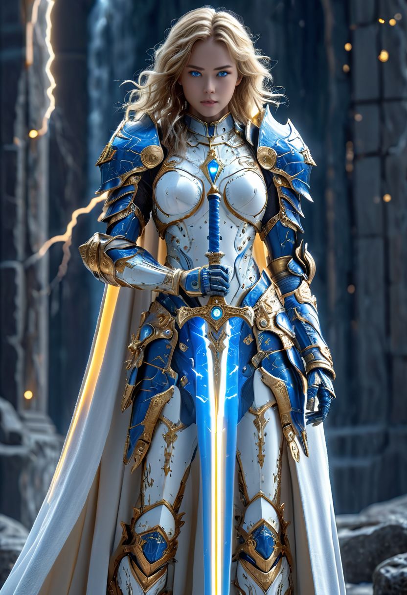 futuristic female paladin, holding a divine, golden blue particles glowing very detailed holy sword, wearing a higly detailed futuristic heavy armour, detailed white mechanical wings, 32k, hyper detailed, ultra detailed, ultra realistic, masterpiece, ((best quality)), high heavens background, full body, <lora:HKStyle:0.8> HKStyle, sharp focus, detailed (particle sword:1.8), front view, symmetrical, centered, glowing dark blue eyes (lightning sword:1.4)